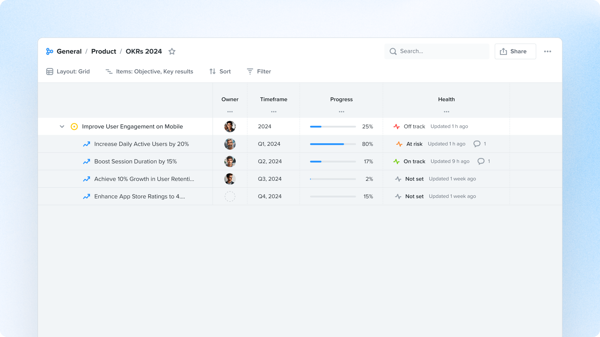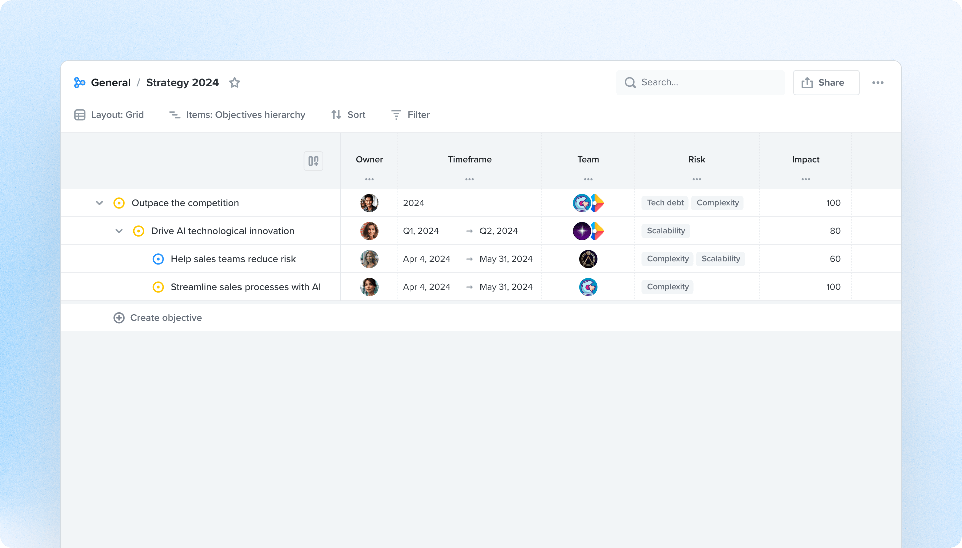That’s why we’re excited to introduce a suite of new capabilities designed to help you drive full alignment and run effective teams at scale. Our new strategic planning capabilities help you connect product initiatives to business outcomes, and stay aligned across all business units and product lines. Plus, dynamic new layouts help you streamline day-to-day operations—removing friction and keeping your team in flow, executing with precision.